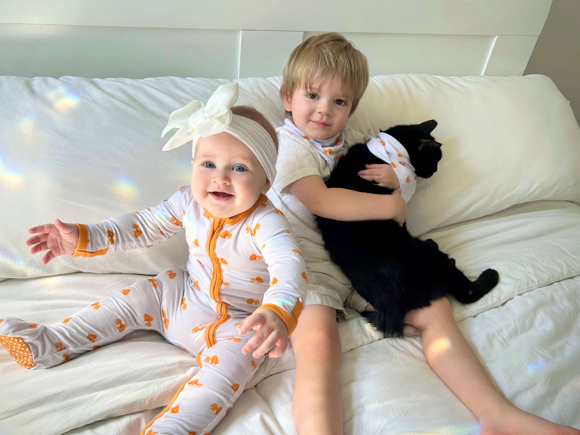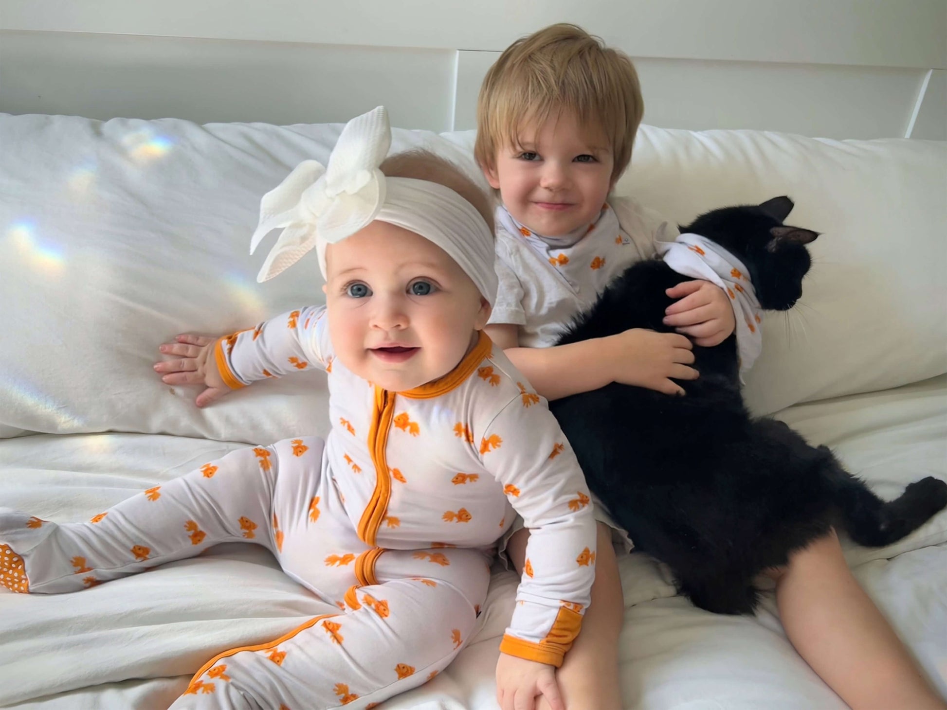 Goldfish print with vibrant orange trim adds a playful touch